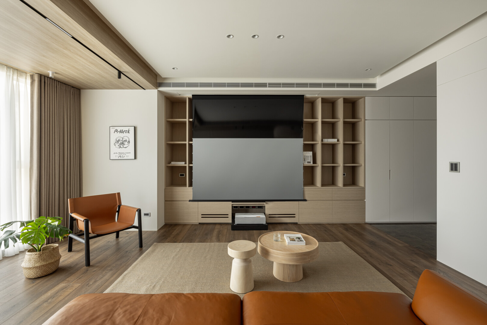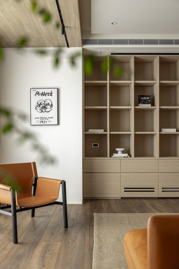 The bookshelf design in the living room replaces the traditional TV wall, serving not only as a practical storage solution but also as the visual focal point of the entire space. The bookshelf cleverly utilizes the vertical dimension of the space, extending from the floor to the ceiling, creating a strong vertical visual extension effect. The matrix arrangement of the shelves has a rhythmic feel, providing an ideal platform for displaying the residents’ personal book collections and collectibles, while infusing the entire space with a strong cultural atmosphere.