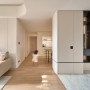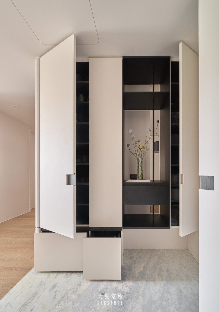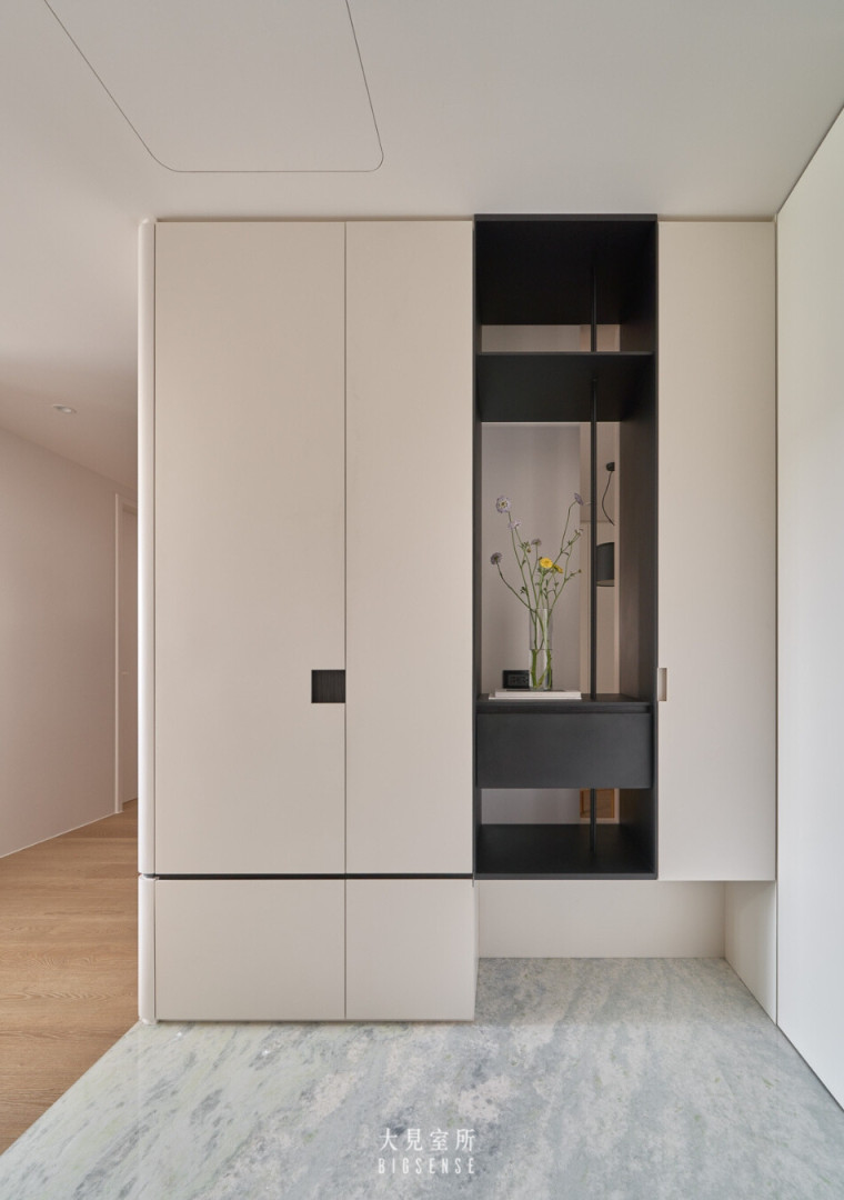 Storage cabinets extend along the walls in a handle-less design, blending seamlessly into the surfaces to maintain a clean and minimal aesthetic. At the entrance, warm white cabinetry contrasts with black iron and wood accents—like the first stroke of a painting—quiet yet full of presence.