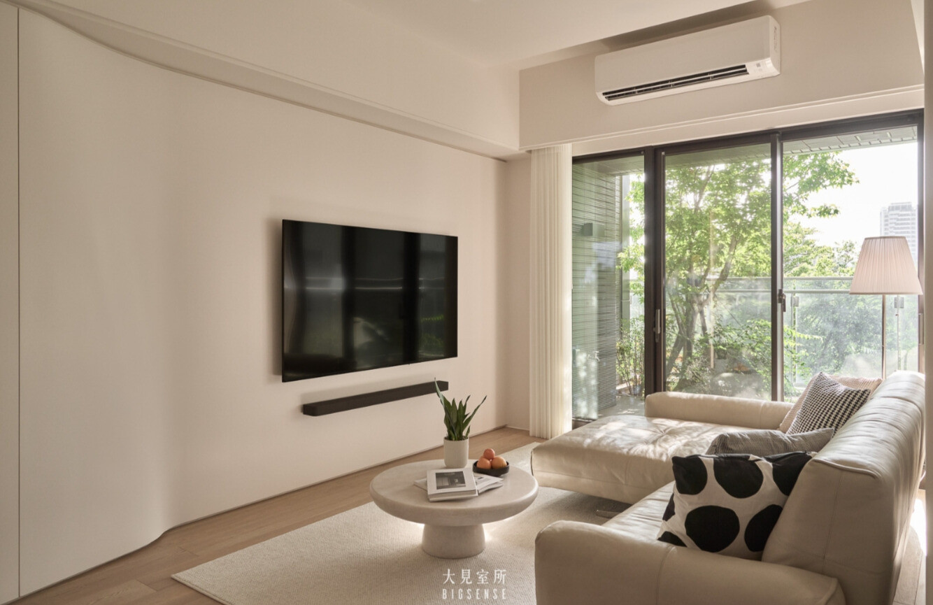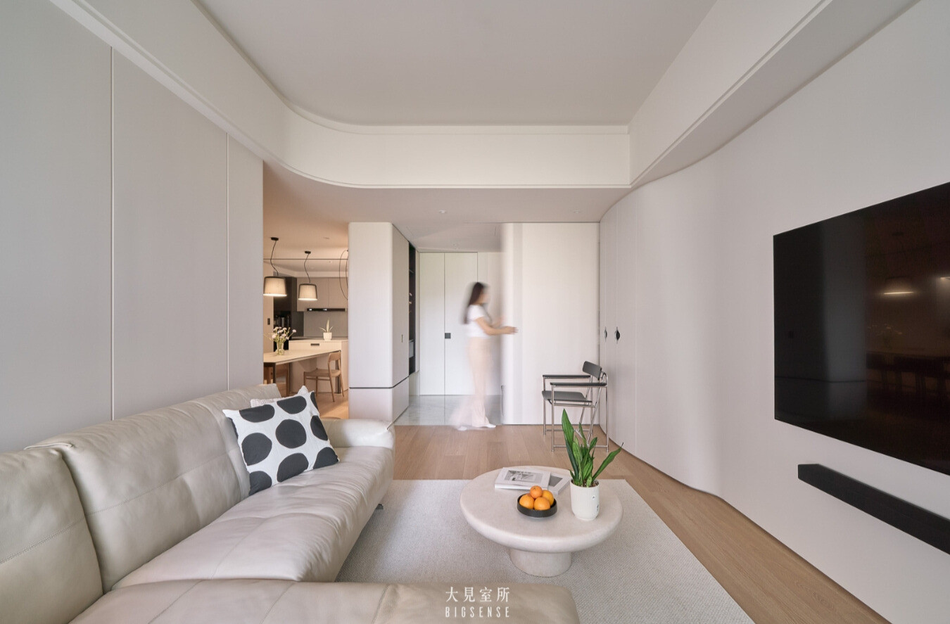 The living room’s TV wall draws inspiration from the flowing curve of a skirt hem, gently moving with the shifting light, bringing the outdoor rhythm indoors, allowing the home to breathe in harmony with time.