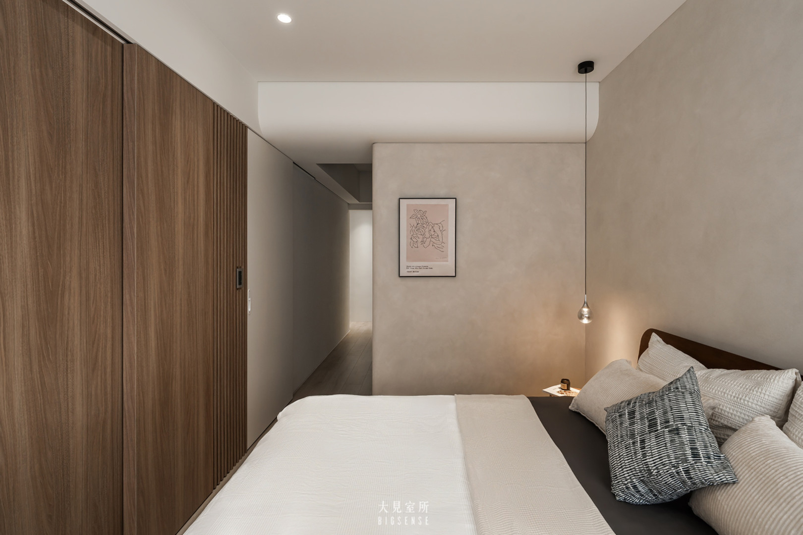 牆面選擇天然礦物塗料,不僅營造質樸氛圍,也能讓空間更具延伸感,形成內斂而安定的視覺語言;床尾的設計用隱藏門解決床對廁所的問題,也順勢規劃了 二次汙衣收納區,讓動線更順,使用起來更直覺。