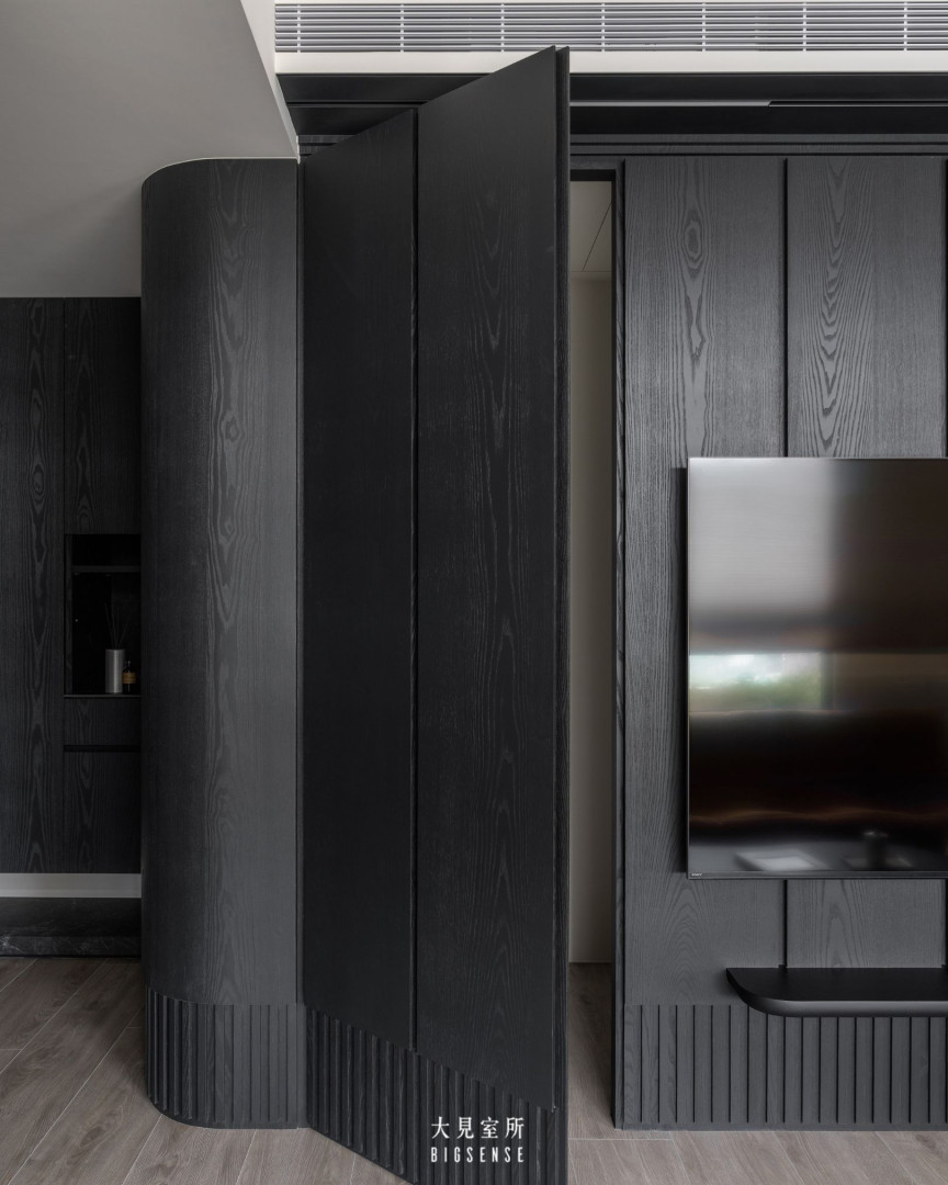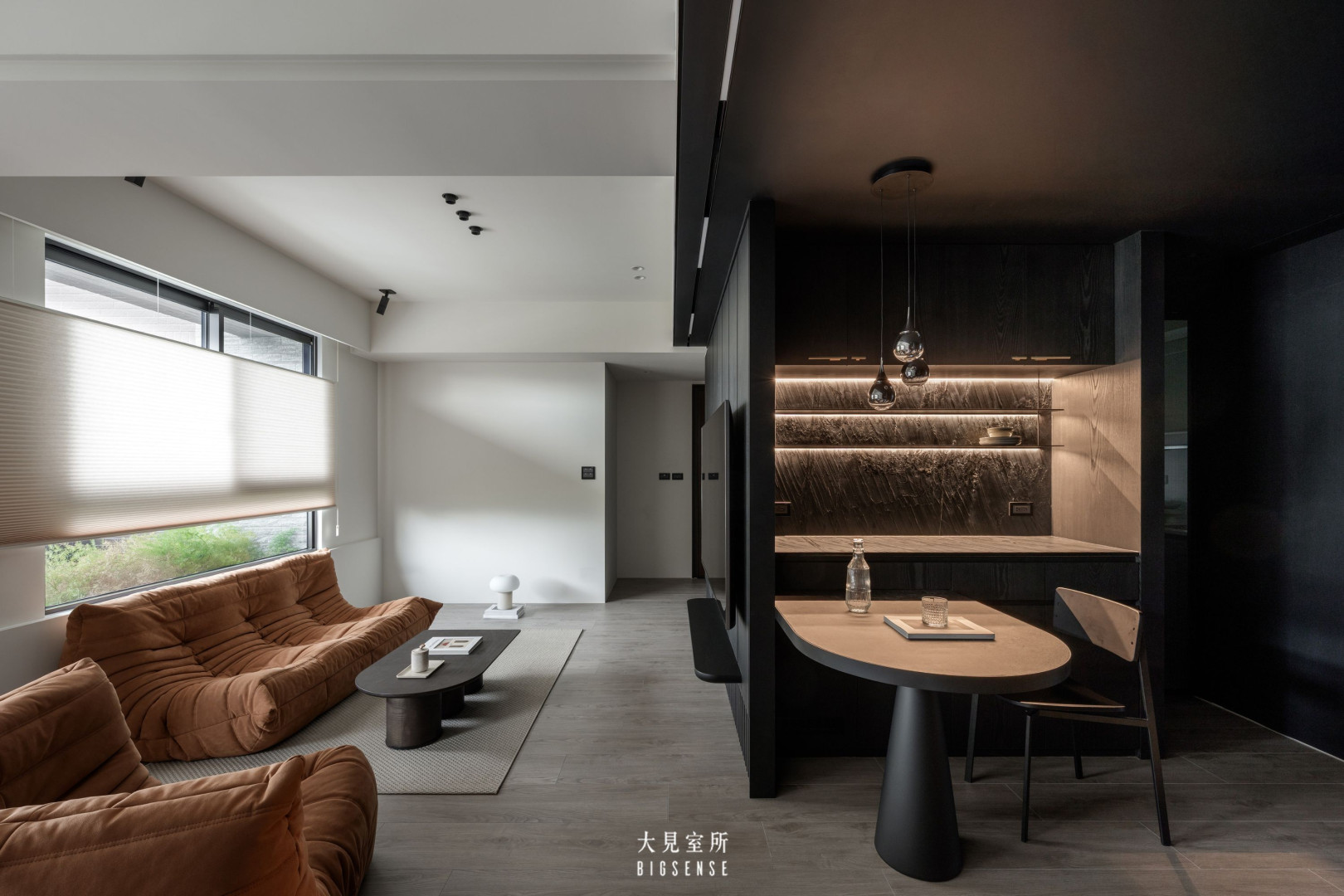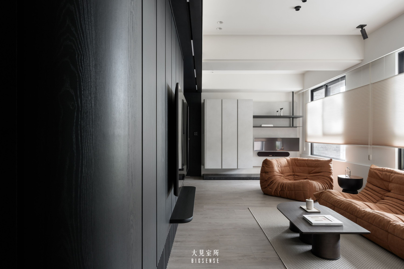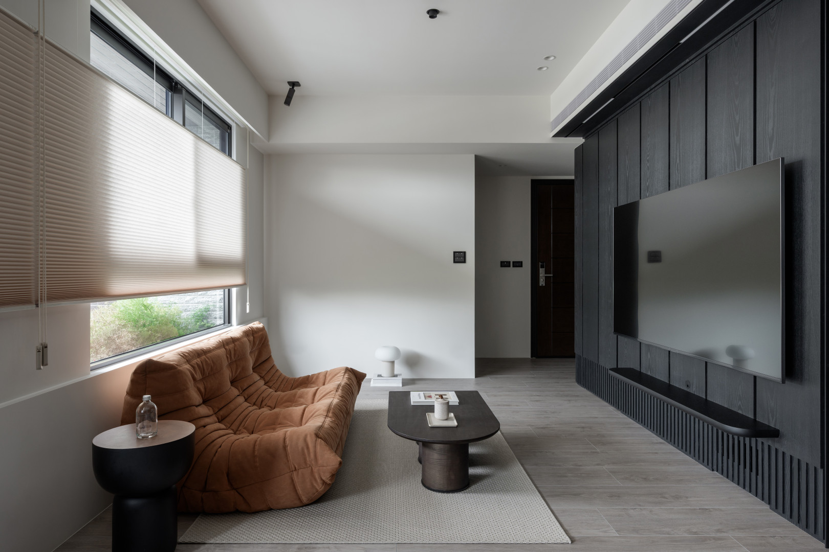 We boldly rotated the TV wall and used a sleek black architectural volume to integrate the TV, kitchen, and storage functions into one cohesive element.his single move divided the home into two layers — black and white:Black represents order, white embodies openness.From then on, the living area gained both a visual anchor and a sense of calm equilibrium.