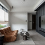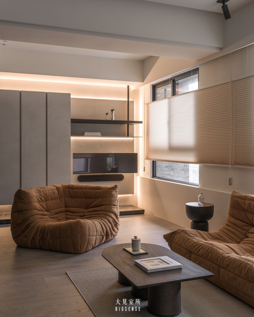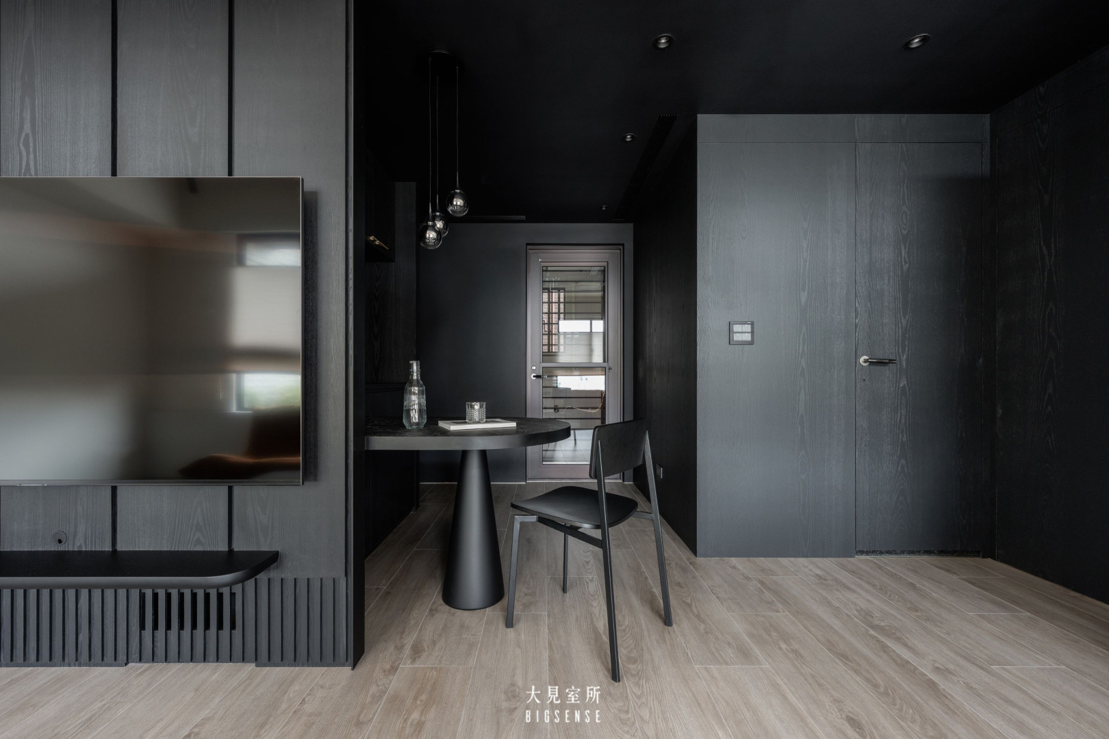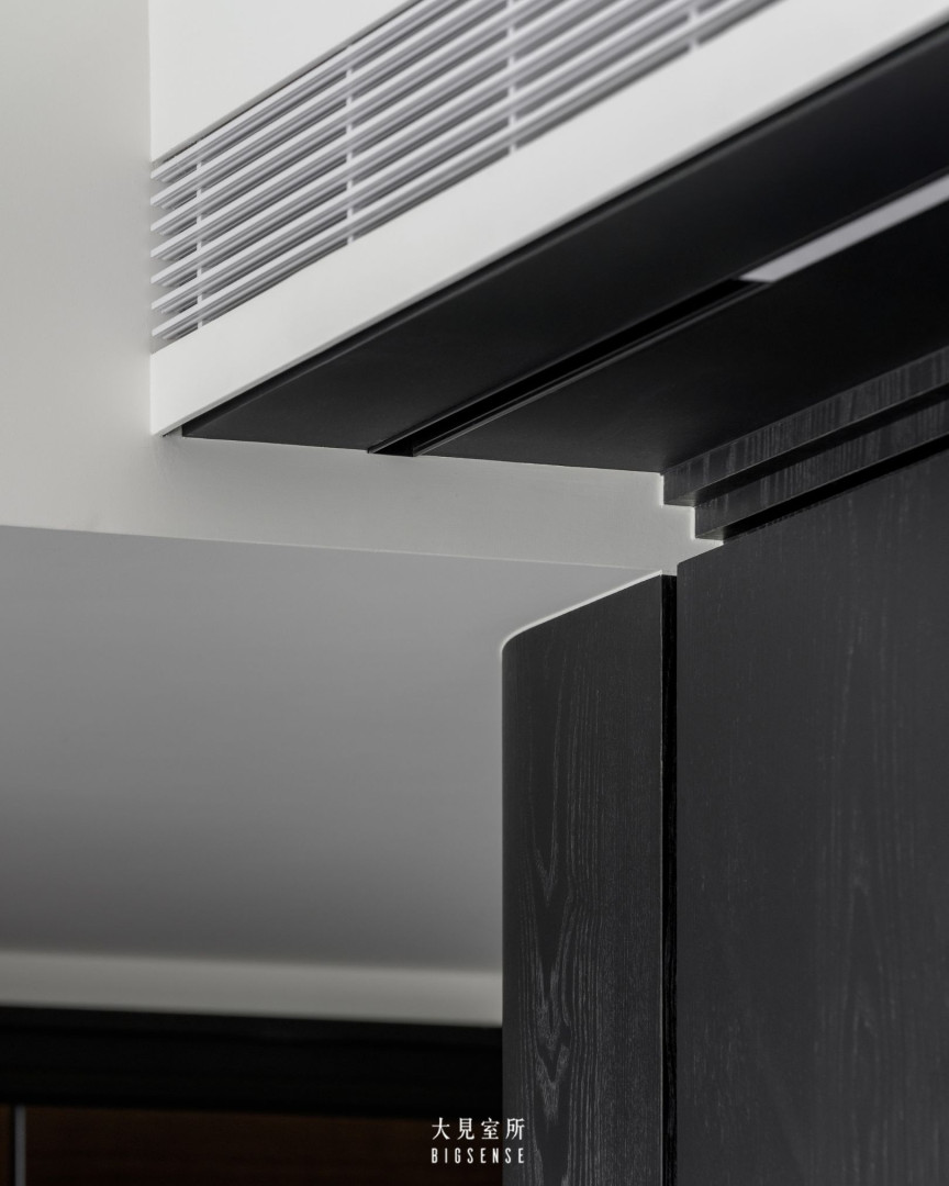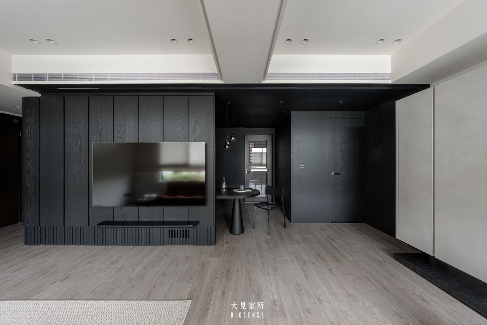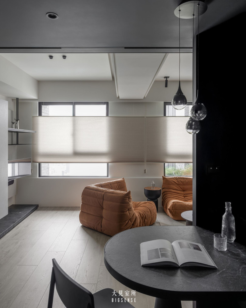 We boldly rotated the TV wall and used a sleek black architectural volume to integrate the TV, kitchen, and storage functions into one cohesive element.his single move divided the home into two layers — black and white:Black represents order, white embodies openness.From then on, the living area gained both a visual anchor and a sense of calm equilibrium.