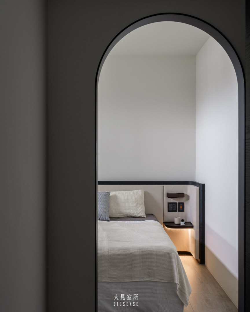 Passing through the soft archway, the gentle glow above the bed feels like a light filter — more than illumination, it offers an emotional transition, allowing the night to softly separate from the day.